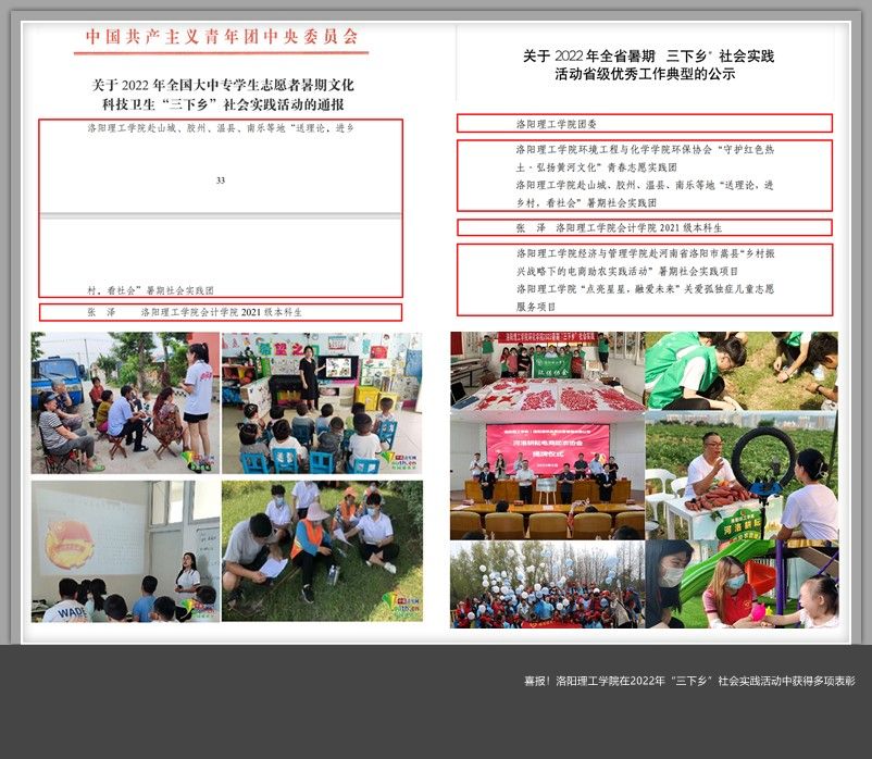 10月,团省委发布《关于2022年全省暑期“三下乡”社会实践活动省级优秀工作典型的公示》,我校团委被授予优秀单位称号;环境工程与化学学院环保协会“守护红色热土·弘扬黄河文化”青春志愿实践团、会马营及灯塔研习社赴山城、胶州、温县、南乐等地“送理论,进乡村,看社会”暑期社会实践团获得优秀团队称号;会计学院2021级本科生张泽获得优秀个人称号;经济与管理学院赴河南省洛阳市嵩县“乡村振兴战略下的电商助农实践活动”暑期社会实践项目、人文与社会科学学院“点亮星星,融爱未来”关爱孤独症儿童志愿服务项目获得优秀品牌项目。首次实现了在该荣誉类别上的全覆盖。