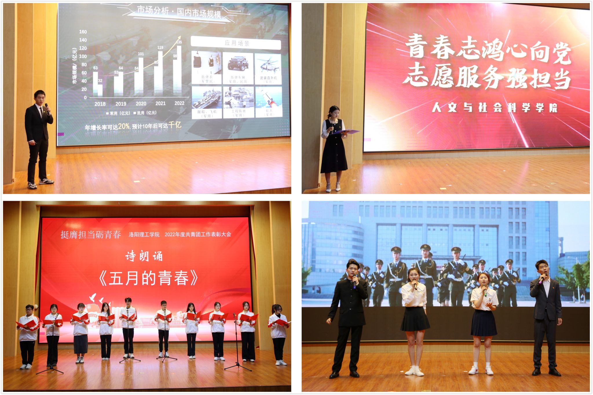 大会在庄严的国歌声中拉开序幕。本次表彰大会分为挑战自我、笃行在我、青春之我、强国有我四个篇章,从不同角度展示了洛理工团员青年青春昂扬、朝气蓬勃的良好风貌。第八届中国国际“互联网+”大学生创新创业大赛国赛银奖项目负责人贾松岩的项目分享,展示了洛理工学子崇尚科学、追求真知、迎接挑战的创新风采;人文与社会科学学院团委副书记孙维艺通过题为《青春志鸿心向党 志愿服务强担当》的工作汇报,展示了二级学院的志愿服务工作思路、开展情况及育人成果;灯塔研习社带来的朗诵《五月的青春》,铿锵有力、振奋人心,是青春理想、青春活力、青春奋斗的铮铮誓言;教育科学与音乐学院四名同学演唱的歌曲《强国一代有我在》,唱响了洛理工青年学子的家国情怀与责任担当。会上,青年团员代表面向团旗,重温入团誓词,伴随着《五月的花海》手势舞表演,大会落下帷幕。