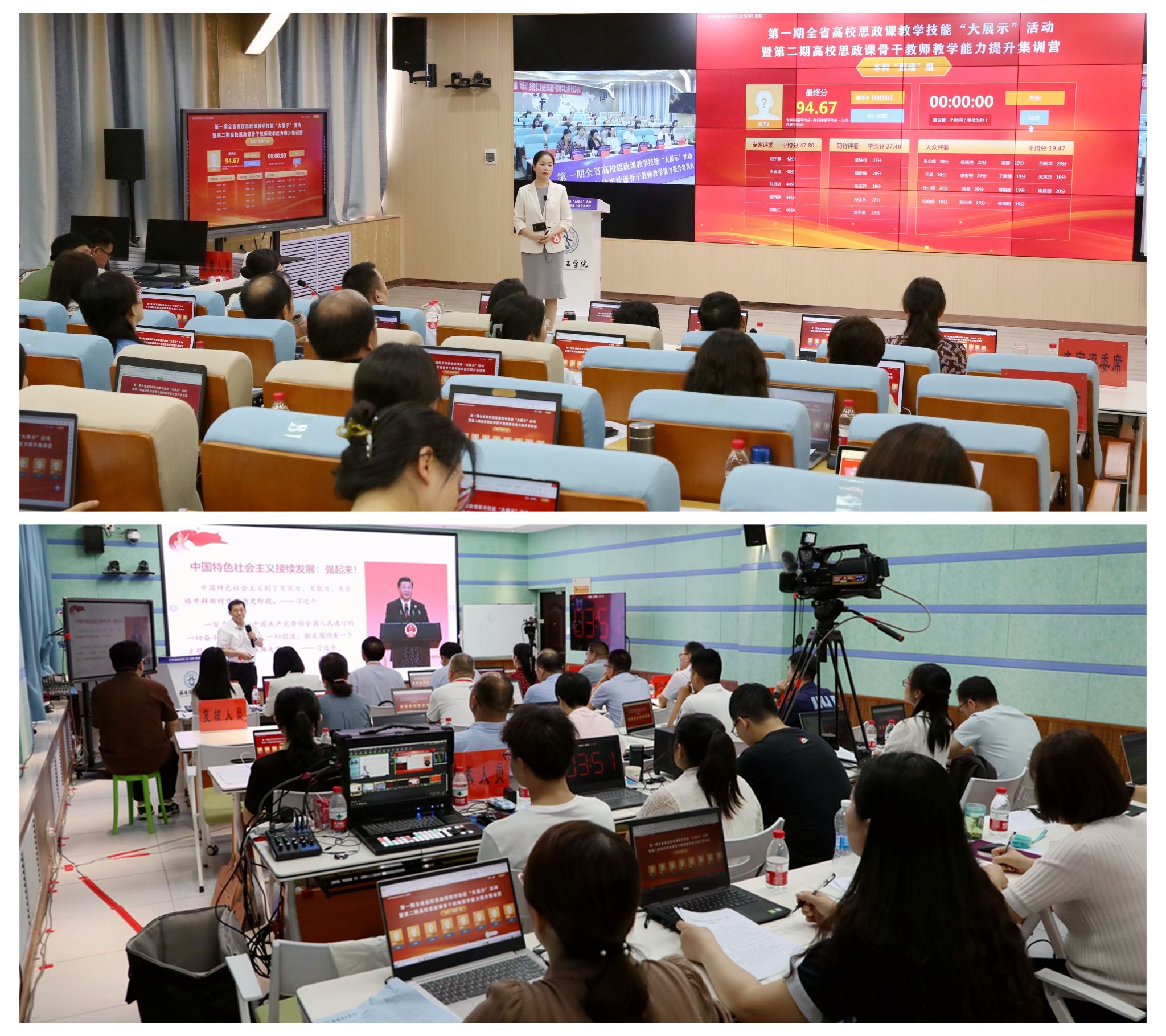 本次活动共有64名选手参赛,均为2022年全省高校思政课教师技能“大比武”特等奖获得者。他们紧紧围绕教学主题,用丰富而扎实的知识、流畅而富有感染力的语言,呈现了一堂堂精彩的思政课。专家评审团、同行评审团以及大众评审团进行现场打分并点评指导。活动通过“豫教思语”微信公众号进行了全程同步直播。