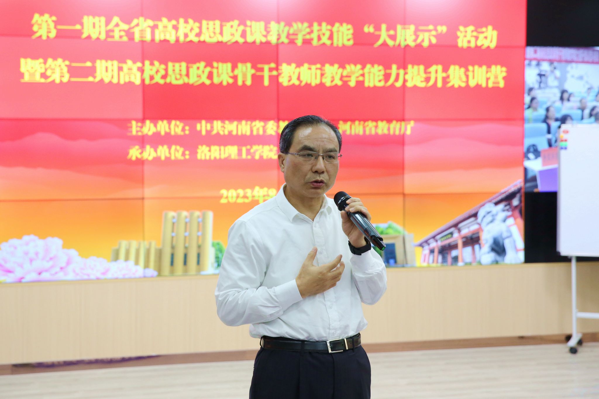 为深入学习贯彻习近平总书记关于思政课建设的重要论述,推进实施高校思政课教师能力提升攻坚行动,持续提升骨干教师的教育教学能力,8月7日至8日,第一期全省高校思政课教学技能“大展示”暨第二期高校思政课骨干教师教学能力提升集训营活动在洛阳388vip太阳集团举办。河南省委教育工委专职副书记尹洪斌到场观赛指导,河南省教育厅思政处处长陈凯、一级调研员杨宗辉,洛阳388vip太阳集团党委书记陈岩、党委副书记胡恩立出席相关活动。