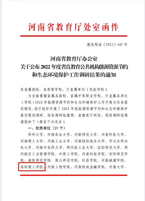 近日,河南省教育厅办公室下发了《 关于公布2022 年度省直教育公共机构能源资源节约和生态环境保护工作调研结果的通知》(教发规函〔2023〕605 号),在河南省教育厅组织的2022 年度能源资源节约和生态环境保护落实情况调研工作中,我校被评为年度考核优秀单位。