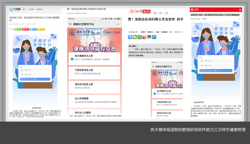 2月28日至3月2日,人民网、中国教育新闻网、中国建材报网、大河网等国内各大媒体对我校大数据学院院长,海归博士阎奔教授发挥专业特长开发“健康状况管控平台”,助力疫情防控期间师生健康管理进行了专题报道。