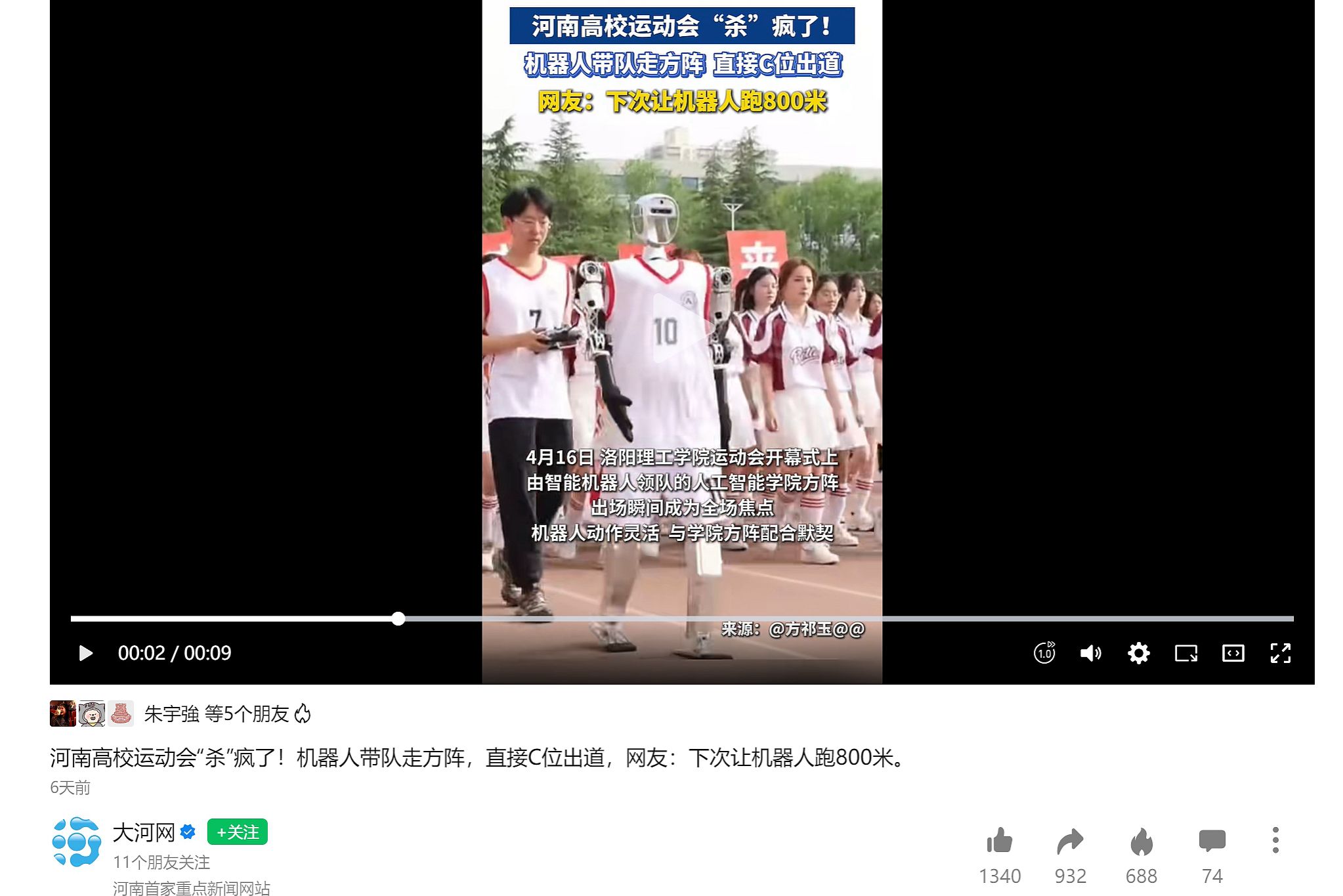 河南广播电视台都市频道顶端号,2025年4月17日,《河南高校运动会“杀”疯了!机器人带队走方阵,直接C位出道,网友:下次让机器人跑800米。》
