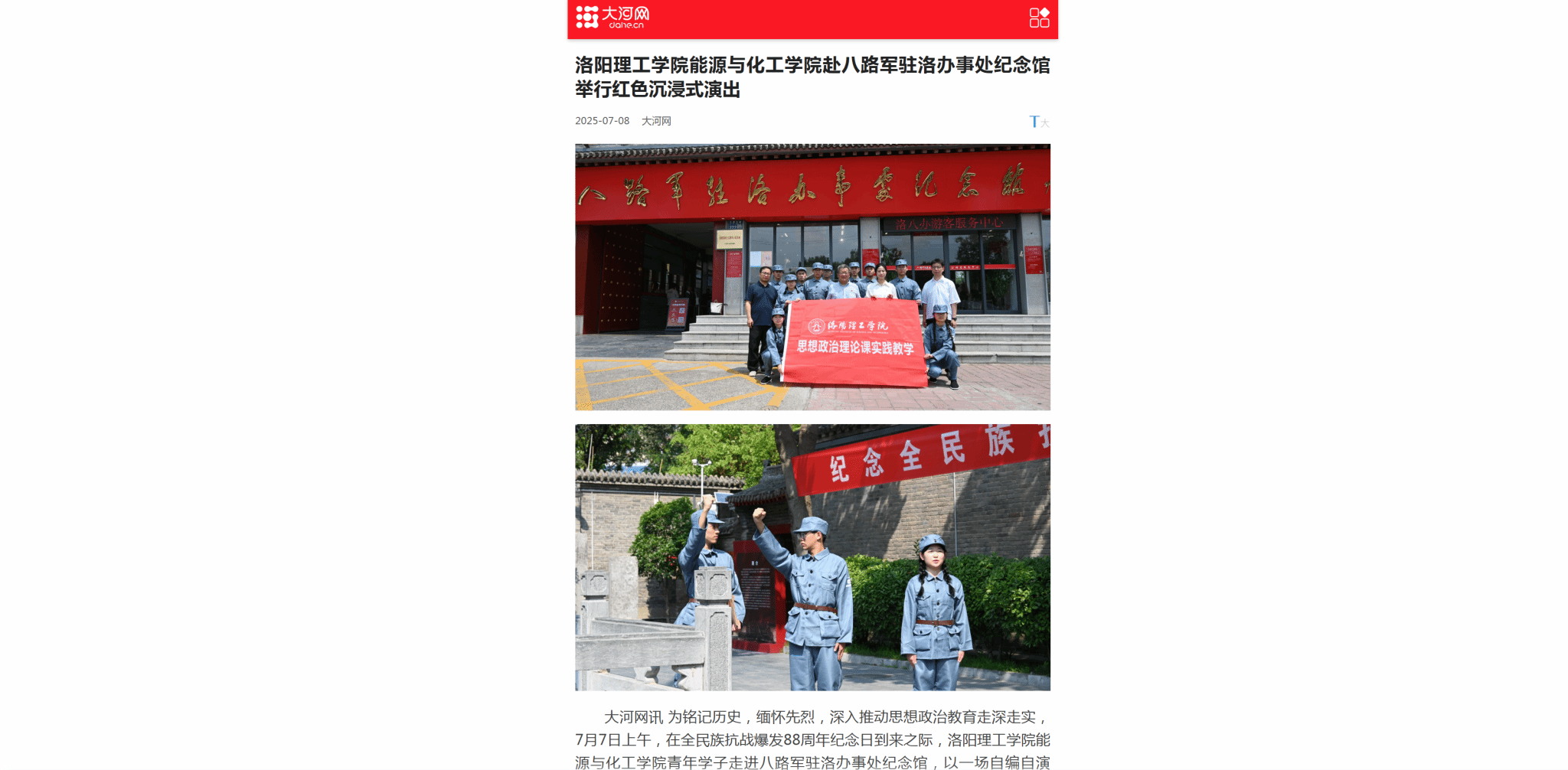 2.大河网,2025年7月8日,《洛阳388vip太阳集团能源与化工学院赴八路军驻洛办事处纪念馆举行红色沉浸式演出》