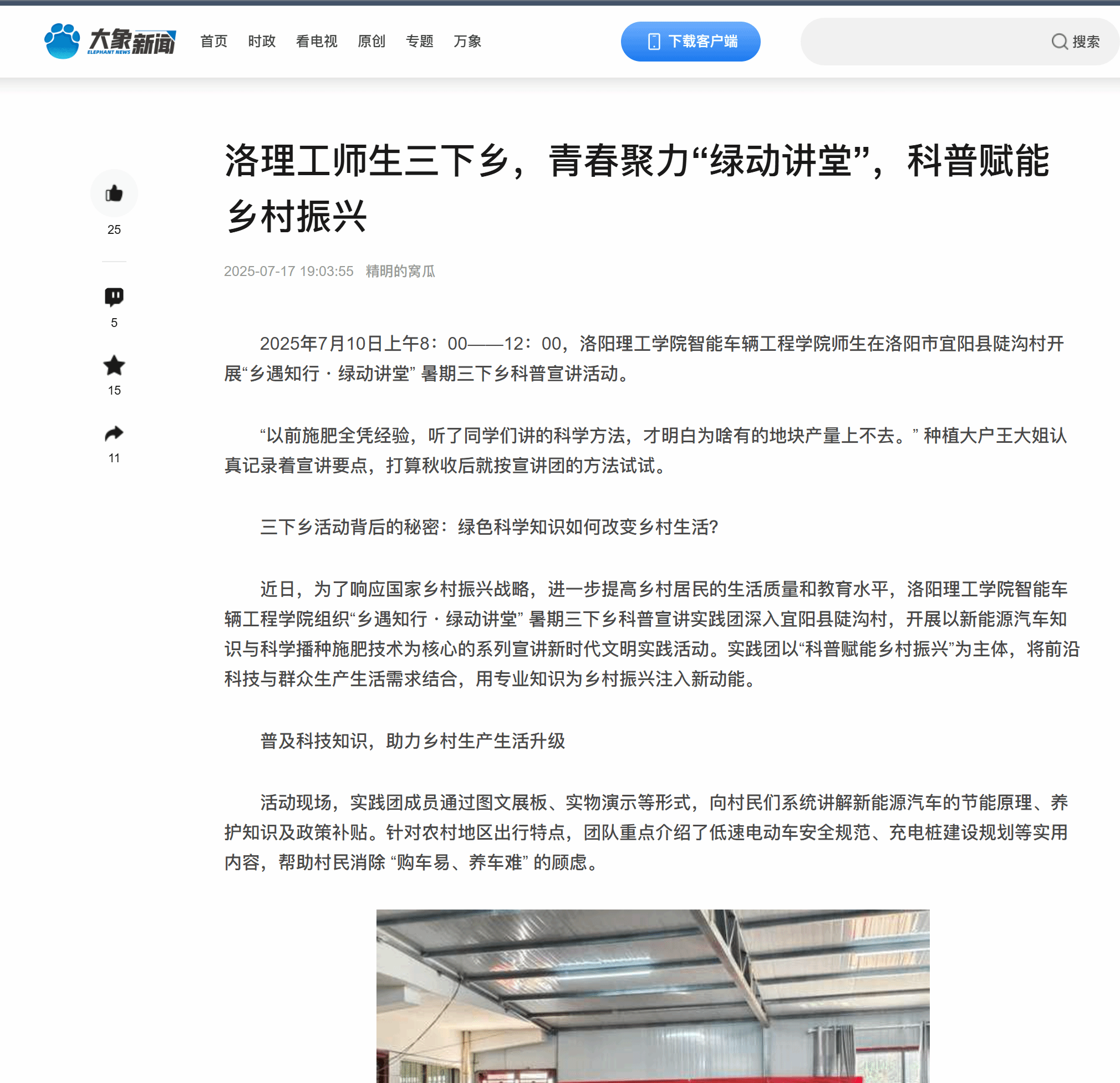 1.大象新闻客户端,2025年7月17日,《洛理工师生三下乡,青春聚力“绿动讲堂”,科普赋能乡村振兴》