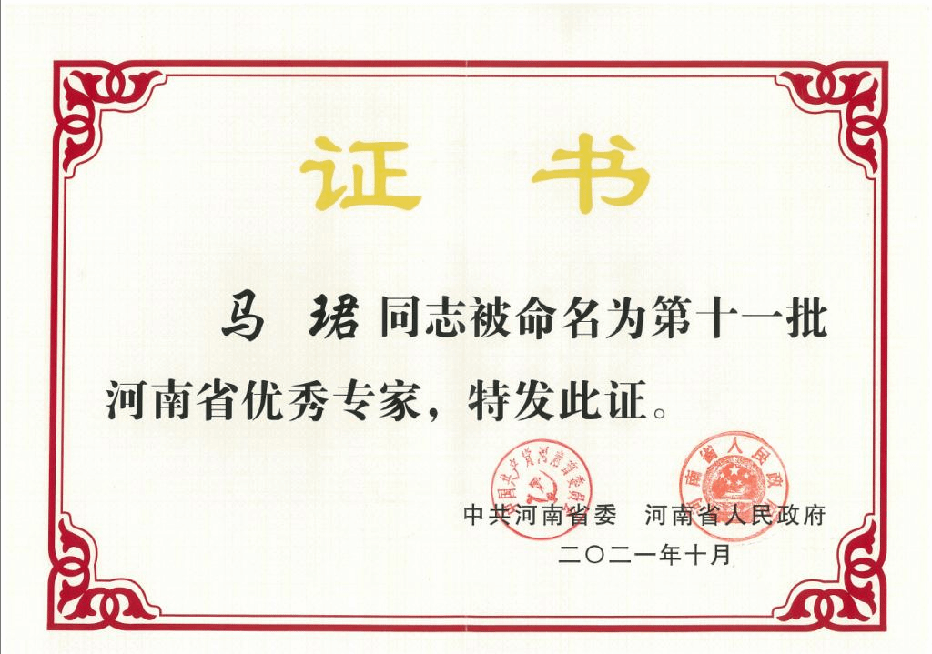 近日,中共河南省委、河南省人民政府联合下发了《关于命名表彰第十一批河南省优秀专家的决定》(豫文[2021]342号),我校马珺教授被授予第十一批河南省优秀专家称号。
