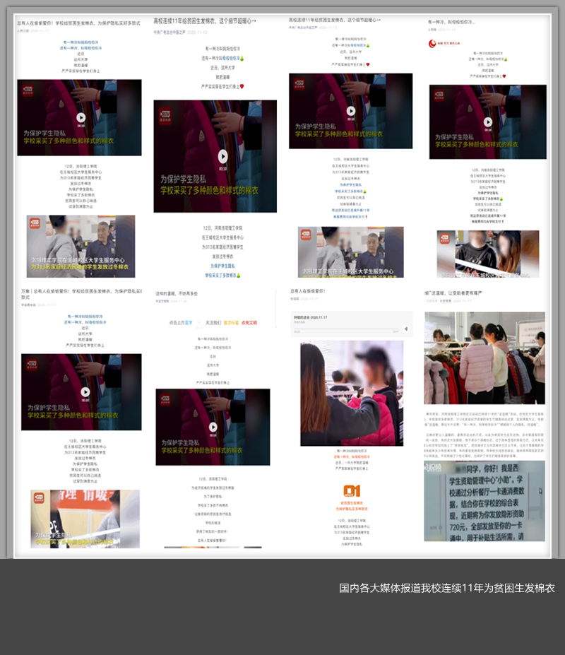 11月12日,我校为313名家庭经济困难学生发放过冬棉衣,保护学生隐私学生自选满意为止的新闻被人民日报、央视新闻、人民网、光明网、环球网、中国青年网、中国教育报、共青团中央、河南日报、河南省教育厅等国内各大媒体报道,登上微博热搜榜单。