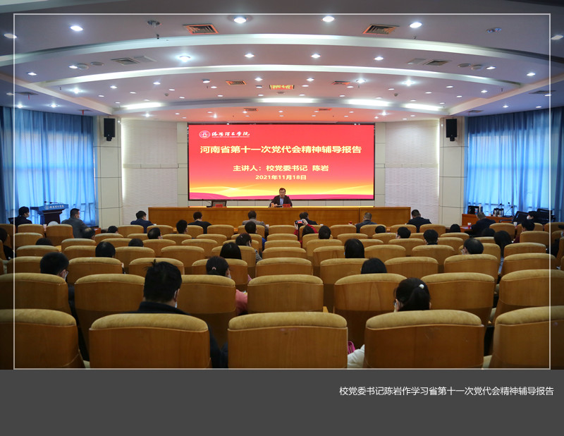 11月18日,校党委书记陈岩教授以《贯彻省第十一次党代会精神,在二次创业的实践中推动学校事业高质量发展》为题,作学习河南省第十一次党代会精神辅导报告。机关党委第一党支部(党政办公室)全体党员、马克思主义学院全体思政课教师参加报告会。