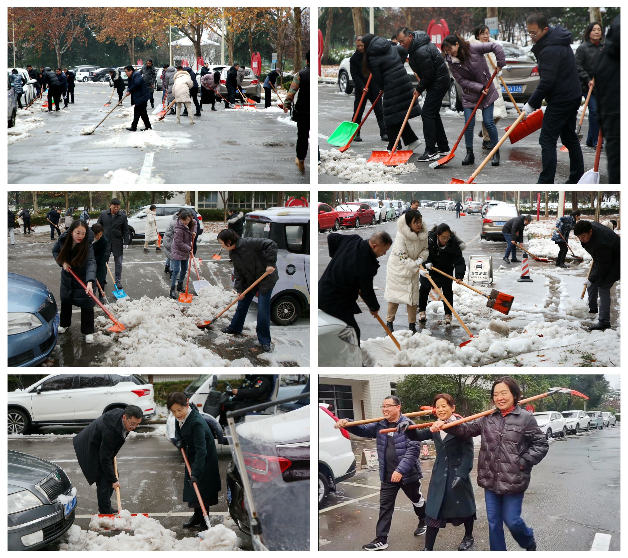 环境工程与化学学院教工在冬日的寒风中,热火朝天地清理积雪。