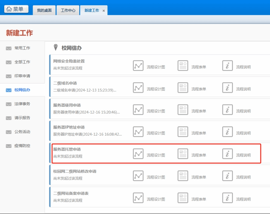此项流程可通过学校OA系统申请实施,OA系统位置:菜单->工作流->新建工作->校网信办->选择“服务器托管申请”(如下图)