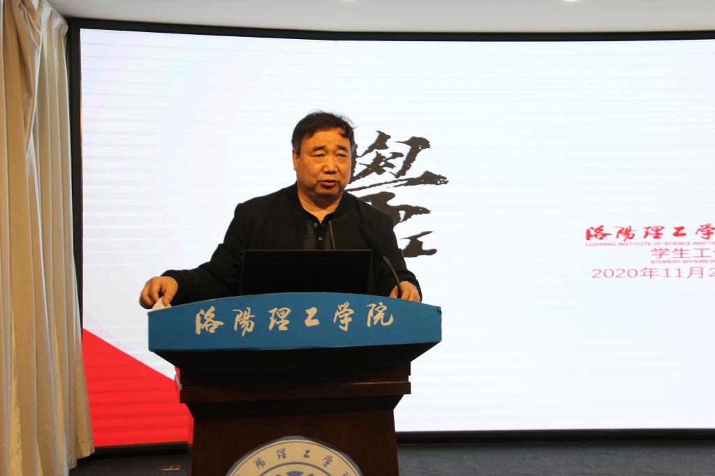 论坛第四项,教育部“全国高校优秀思政课示范课百人巡讲团”成员、全国高校思政课教学能手、河南省青年理论宣讲专家,中共洛阳市委宣讲团成员。马克思主义学院副院长侯丙孬副教授,为学工队伍作“十九届五中全会”学习辅导。侯院长从“深刻认识我国进入新发展阶段的重大意义,有利条件和重要特征。”、“准确把握2035年远景目标和‘十四五’时期我国发展的指导方针、主要目标、重点任务。”、“牢牢把握构建新发展格局的战略构想和重要着力点。”和“坚持党的全面领导,动员各方面力量,为实现‘十四五’规划和2035年远景目标而团结奋斗。”四个方面对全体学工队伍进行了讲解辅导。