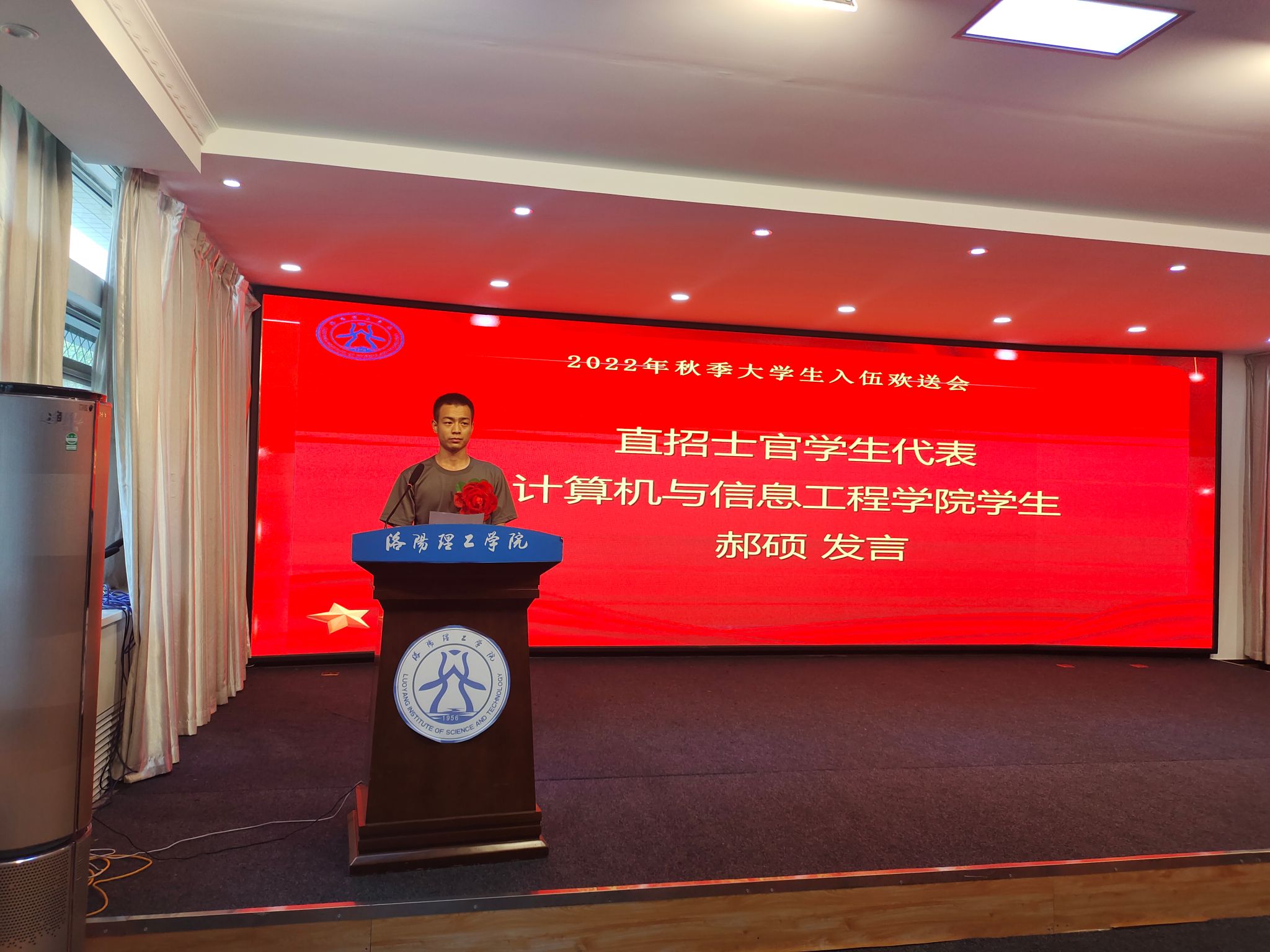 欢送会上,校武装部负责人宣读了2022年秋季入伍学生名单。土木工程学院学生王浩宇,计算机与信息工程学院学生郝硕代表全体入伍新兵依次发言,表达了自己建功军营的决心。人文与社会科学学院靳景代表辅导员为入伍学生送上祝福,希望能够把握机会,锤炼身体素质,磨砺精神意志,在军营挥洒青春热血,用行动助力国防现代化建设,彰显当代大学生的精神风貌,做一名合格的大学生士兵。